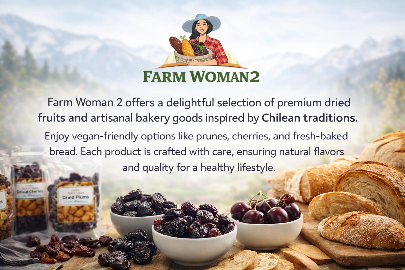Farm Woman 2 offers a delightful selection of premium dried fruits and artisanal bakery goods inspired by Chilean traditions. Enjoy vegan-friendly options like prunes, cherries, and fresh-baked bread. Each product is crafted with care, ensuring natural flavors and quality for a healthy lifestyle.